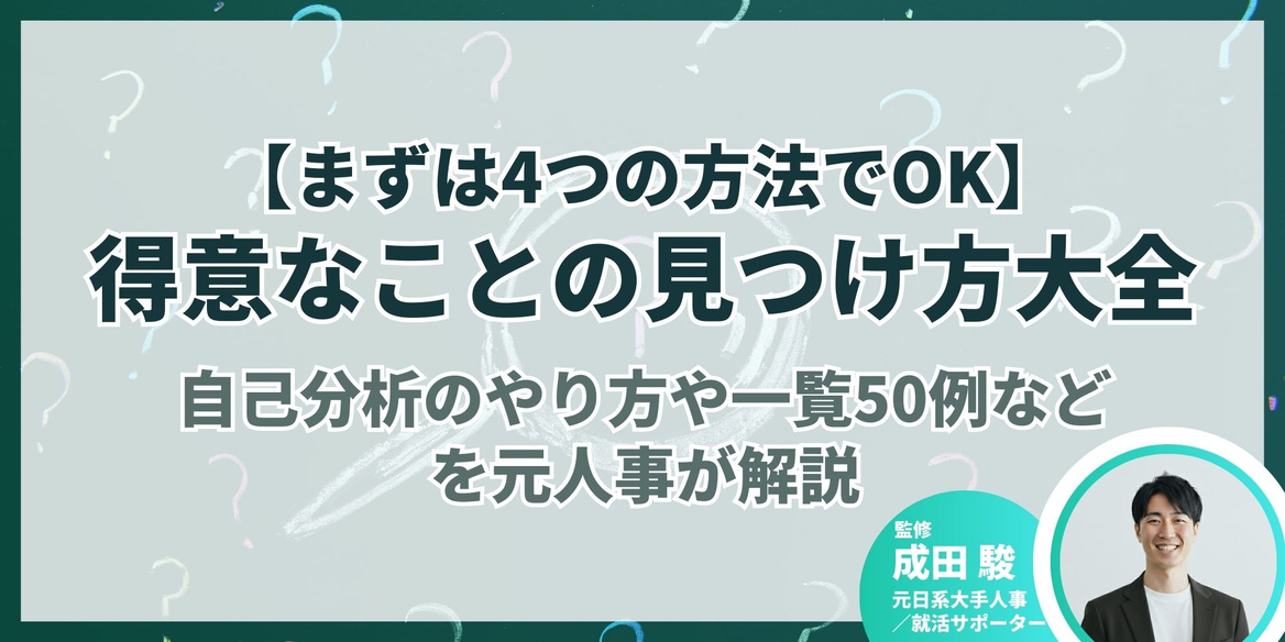 この記事では、元日系大手人事で、en-courageの就活サポーターとして延べ3,000名以上の学生を支援してきた成田さん監修のもと、まずは試したい4つのおすすめの方法を中心に、得意なことの見つけ方を詳しく解説します。一覧50選やES・面接での答え方も紹介しているので、ぜひ参考にしてください。