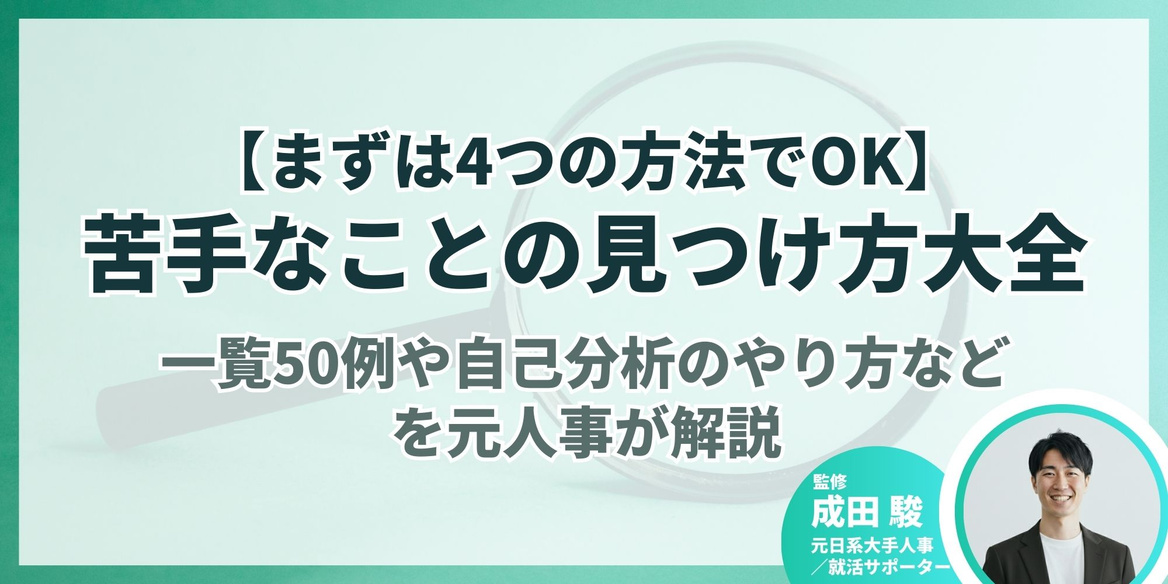 この記事では、元日系大手人事で、en-courageの就活サポーターとして延べ3,000名以上の学生を支援してきた成田さん監修のもと、まずは試したい4つのおすすめの方法を中心に、苦手なことの見つけ方を詳しく解説します。一覧50選やES・面接での答え方も紹介しているので、ぜひ参考にしてください。