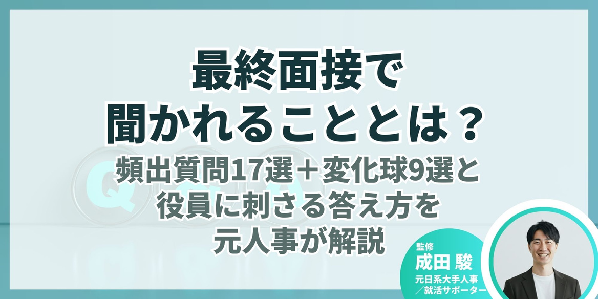 今回は、元日系大手人事で、en-courageの就活サポーターとして延べ3,000名以上の学生を支援してきた成田さん監修のもと、最終面接で聞かれる頻出質問17選と変化球質問9選の回答例、差がつくポイントと注意点を解説します。