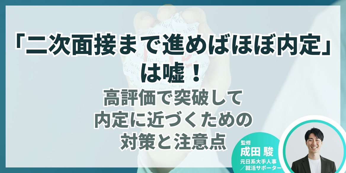 「二次面接まで進めばほぼ内定」という噂を信じていませんか。成田さんが就活サポーターとして支援していると、この噂を鵜呑みにして対策を怠り、二次面接で不合格になる学生を何人も見てきたそうです。ここでは噂の真偽と、通過率を高めるために押さえておくべきポイントを解説します。