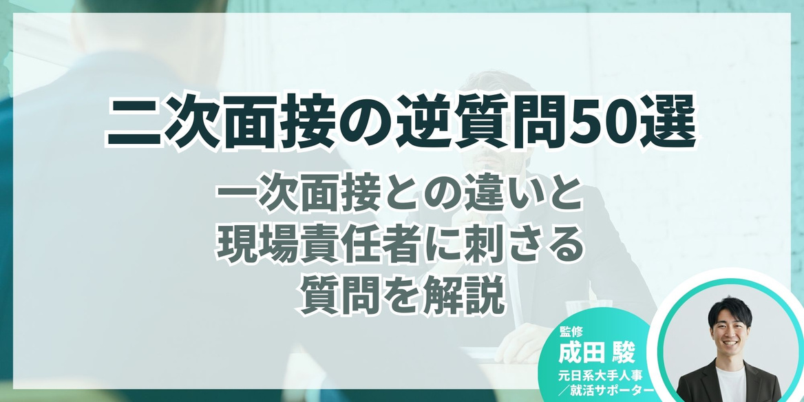 今回は、元日系大手人事で、en-courageの就活サポーターとして延べ3,000名以上の学生を支援してきた成田さん監修のもと、二次面接で評価される逆質問50選と、オリジナル質問を作る5つの公式、評価を稼ぐコツを解説します。