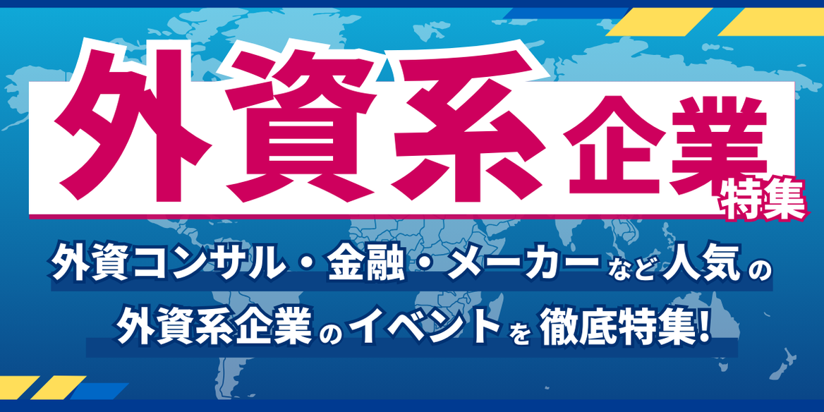 外資系企業のイベントのみをピックアップ📢 外資戦略コンサルなどを筆頭に、今申し込める外資イベントを掲載しています。 インターン/座談会/プレエントリー/説明会など、注目のイベント情報を掲載中✨ 「グローバルな舞台で活躍したい」「実力を適切に評価されたい」そんなあなたは必見です!