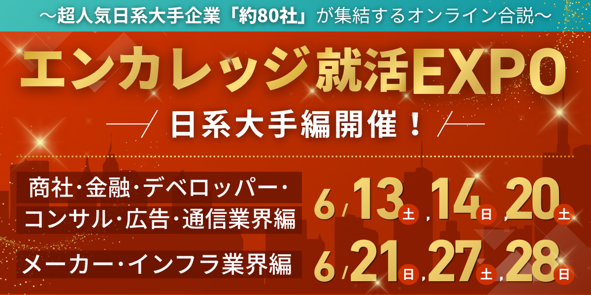 サマーインターン激化期に入る前に、超人気日系大手企業と出会え、広く深く「業界研究/企業研究/職種研究」ができる、史上初・日本最大級のメガイベントです。