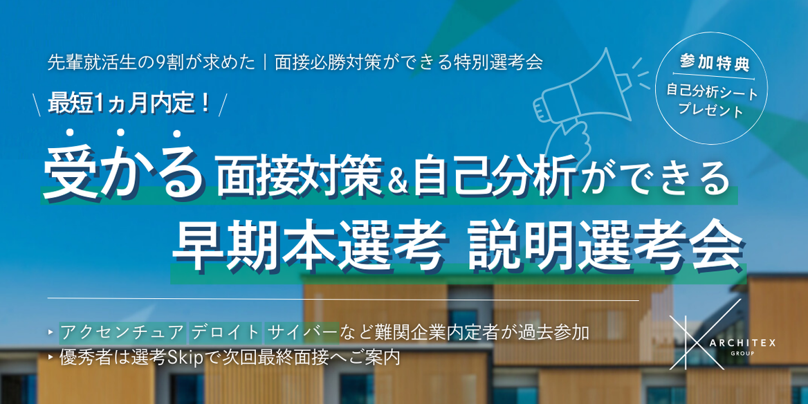 創業以来、東海圏を中心に25年間連続で黒字化を達成している愛知県発のグローバル企業アーキテックスから、就活を頑張る皆様へ必見の選考対策イベントをご用意!