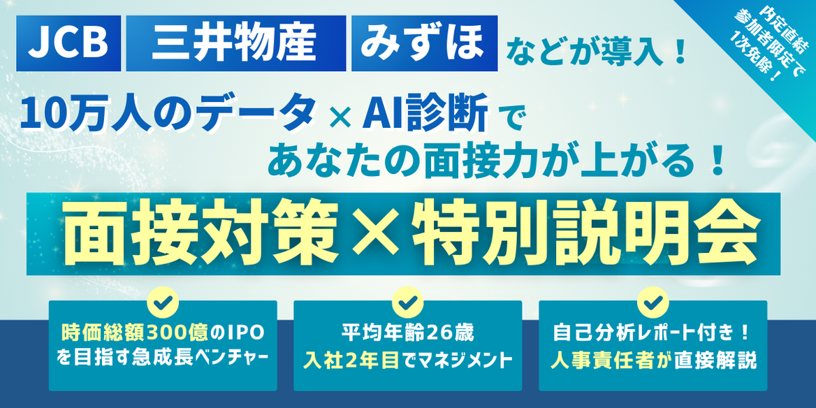 【1次選考免除】三井物産・みずほも導入!『AI診断×面接対策』で人事責任者が"10万人のデータに基づく面接合格法"をフィードバック