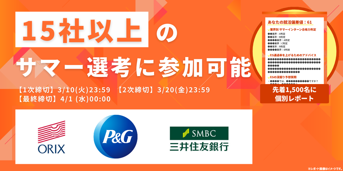 「P&Gジャパン」「SMBC」「オリックス」など、就活人気企業(約15社)の選考パスを獲得できる絶好のチャンス!