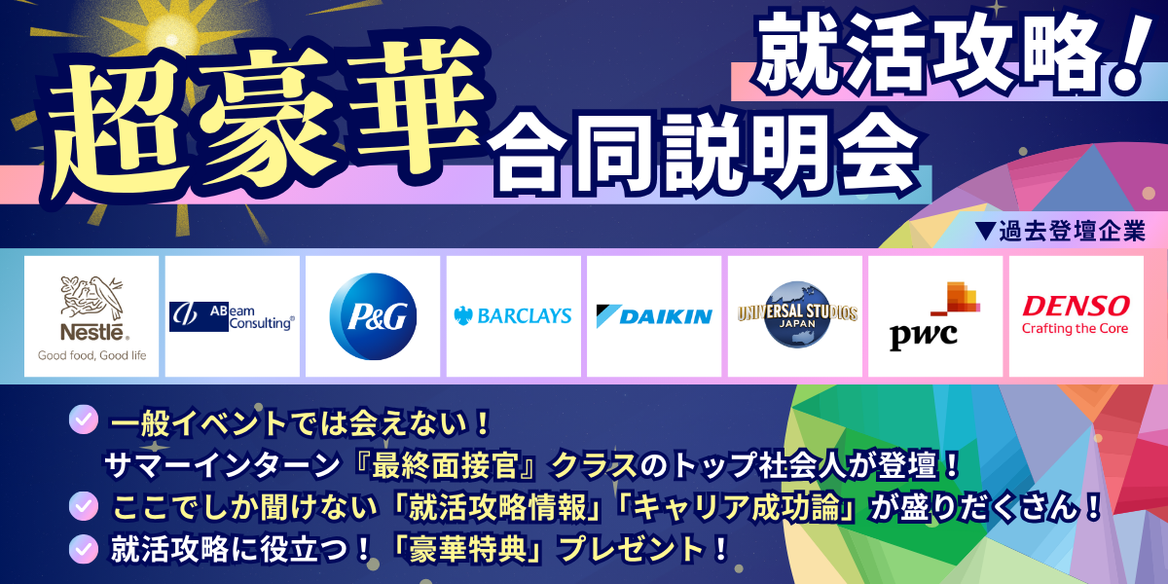 登壇企業としても、「業界最大手企業」「就活人気企業」など超豪華なラインナップでの開催です!