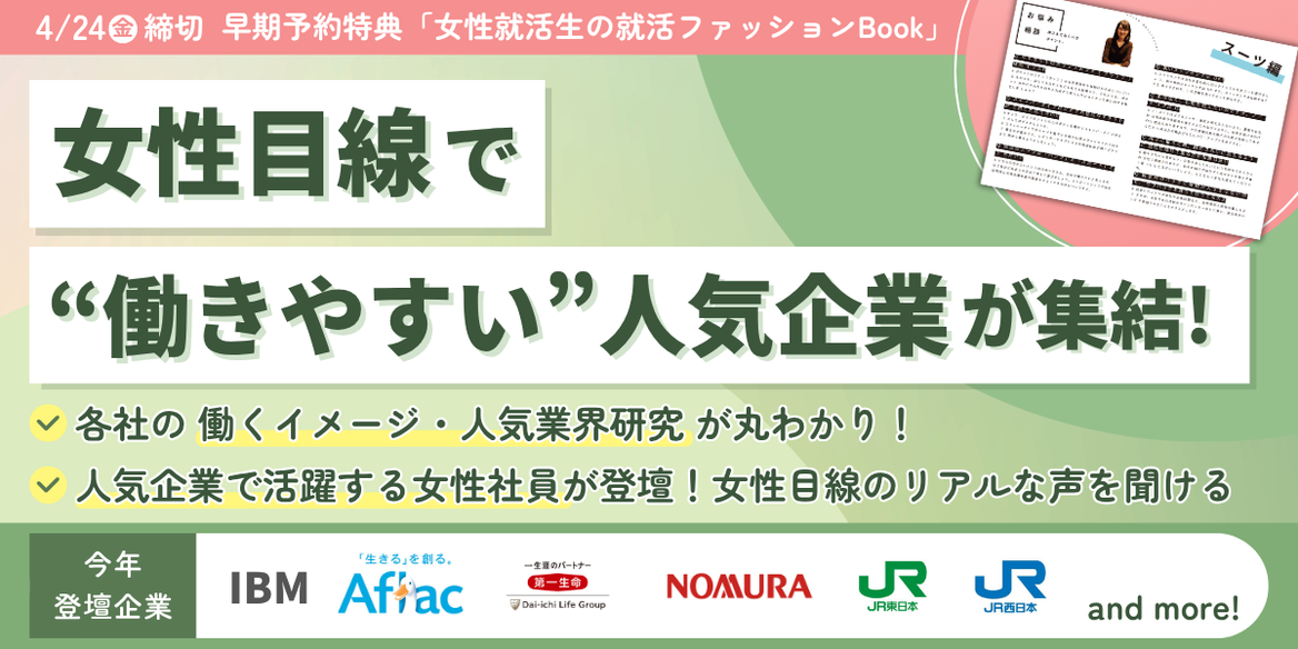 例年、女性就職人気企業が多数参画する人気イベントですので、満枠になる前にお早めのご予約を推奨いたします。