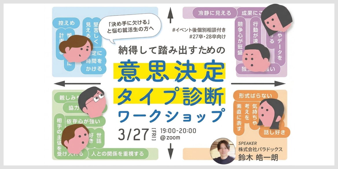 この2つを組み合わせて意思決定のタイプを明らかにし、「なぜ自分はこの道を選ぶのか」を自信をもって語れるようになることが本講座のゴールです。